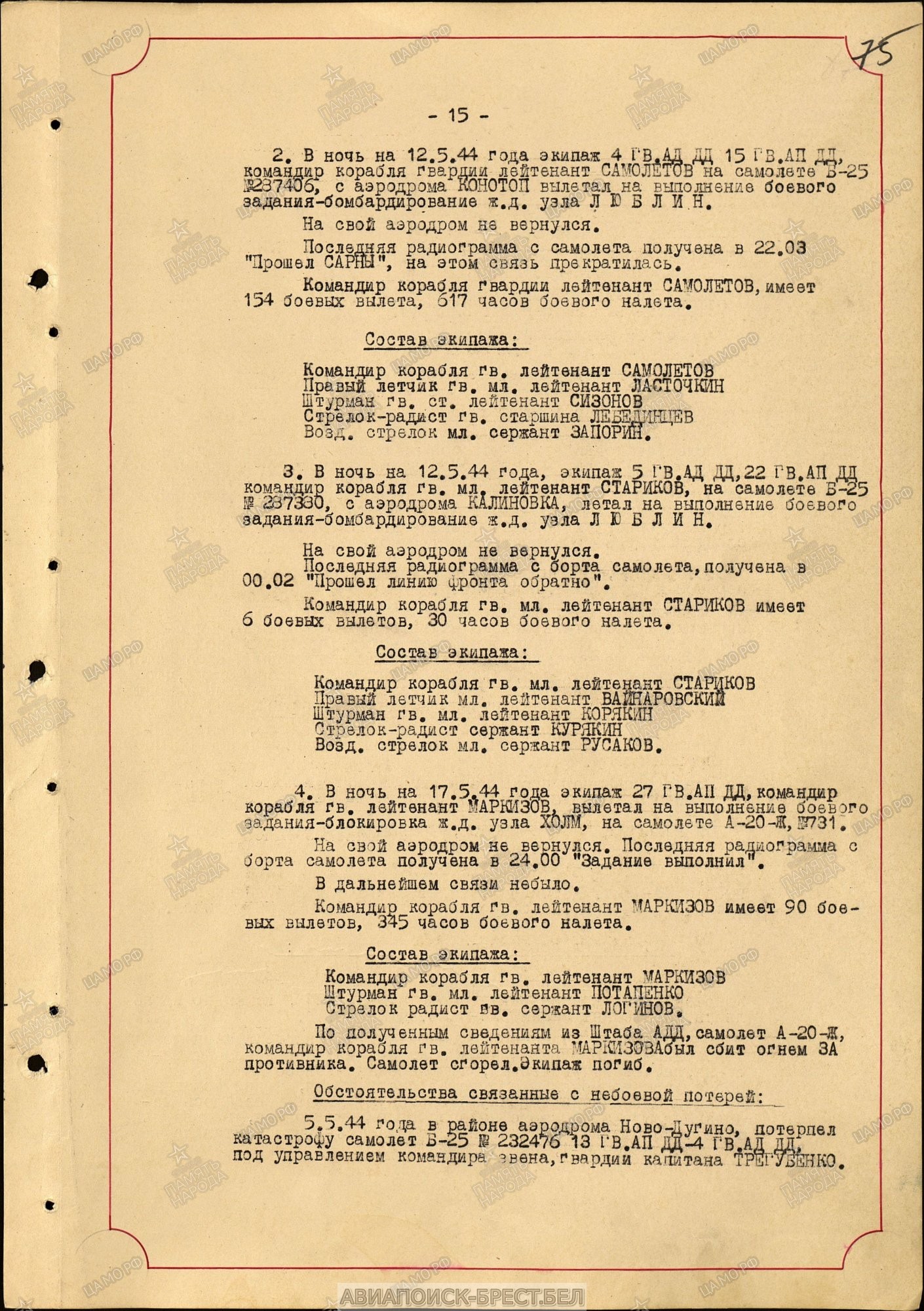 Списать с полка самолёт А-20-Ж № 253722 с Райт-Циклон: левый 42-154130, правый 42-154105, пилотируемый гв.л-том Маркизовым, НБЗ в ночь с 16-17.05.44. Основание: подтверждение партизан о том, что самолёт сгорел (отношение штаба АДД от 23.05.44 на имя командира 4 гв. АК ДД)