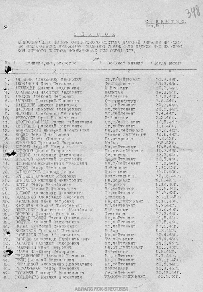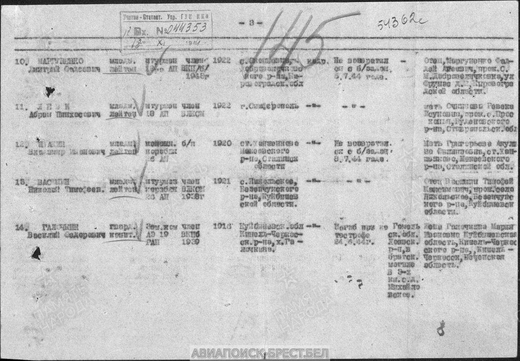 Пилот А-20G «Бостон», младший лейтенант: 45 авиационный полк истребителей Дальнего Действия (Особого Назначения), выбыл из воинской части: 02.04.1944